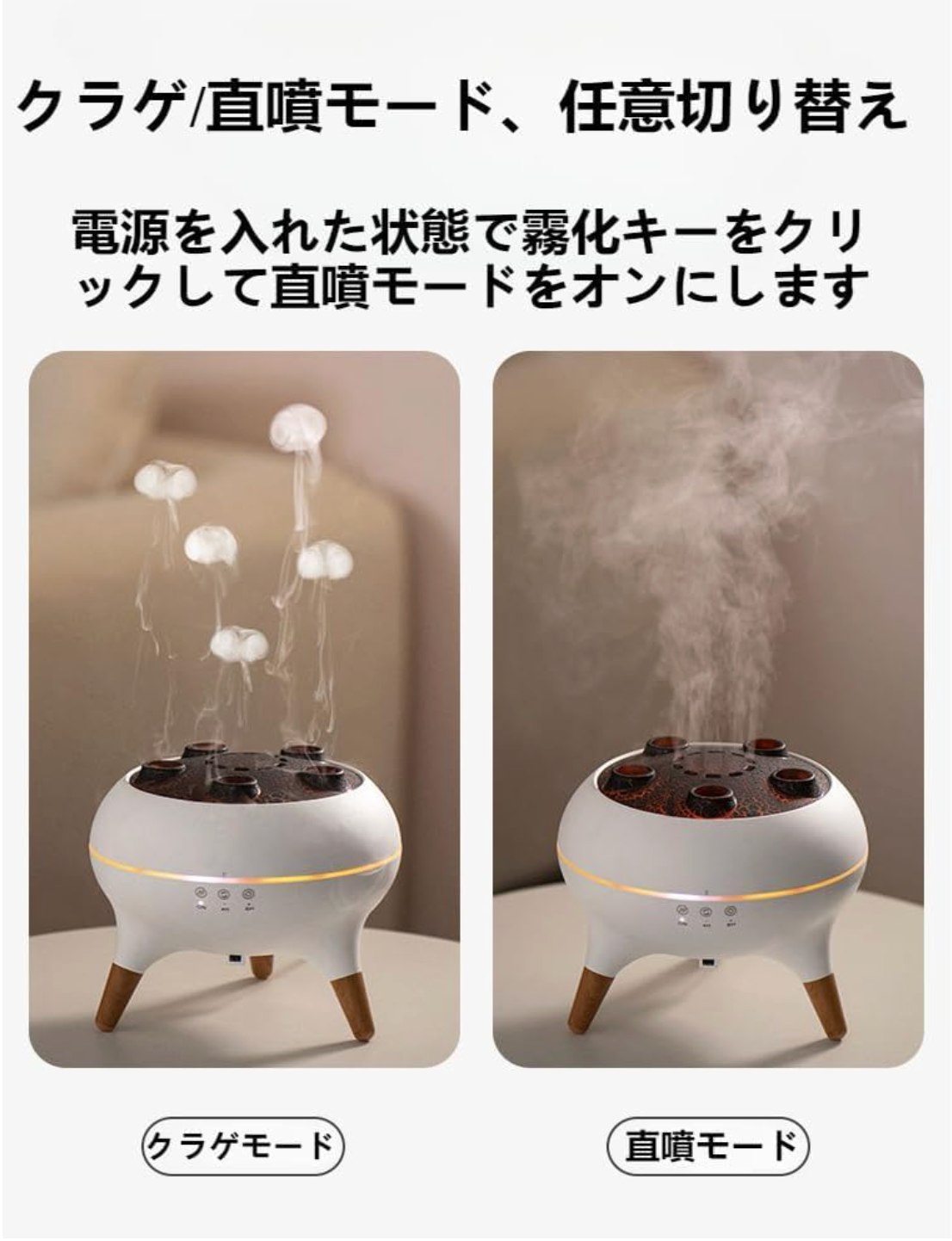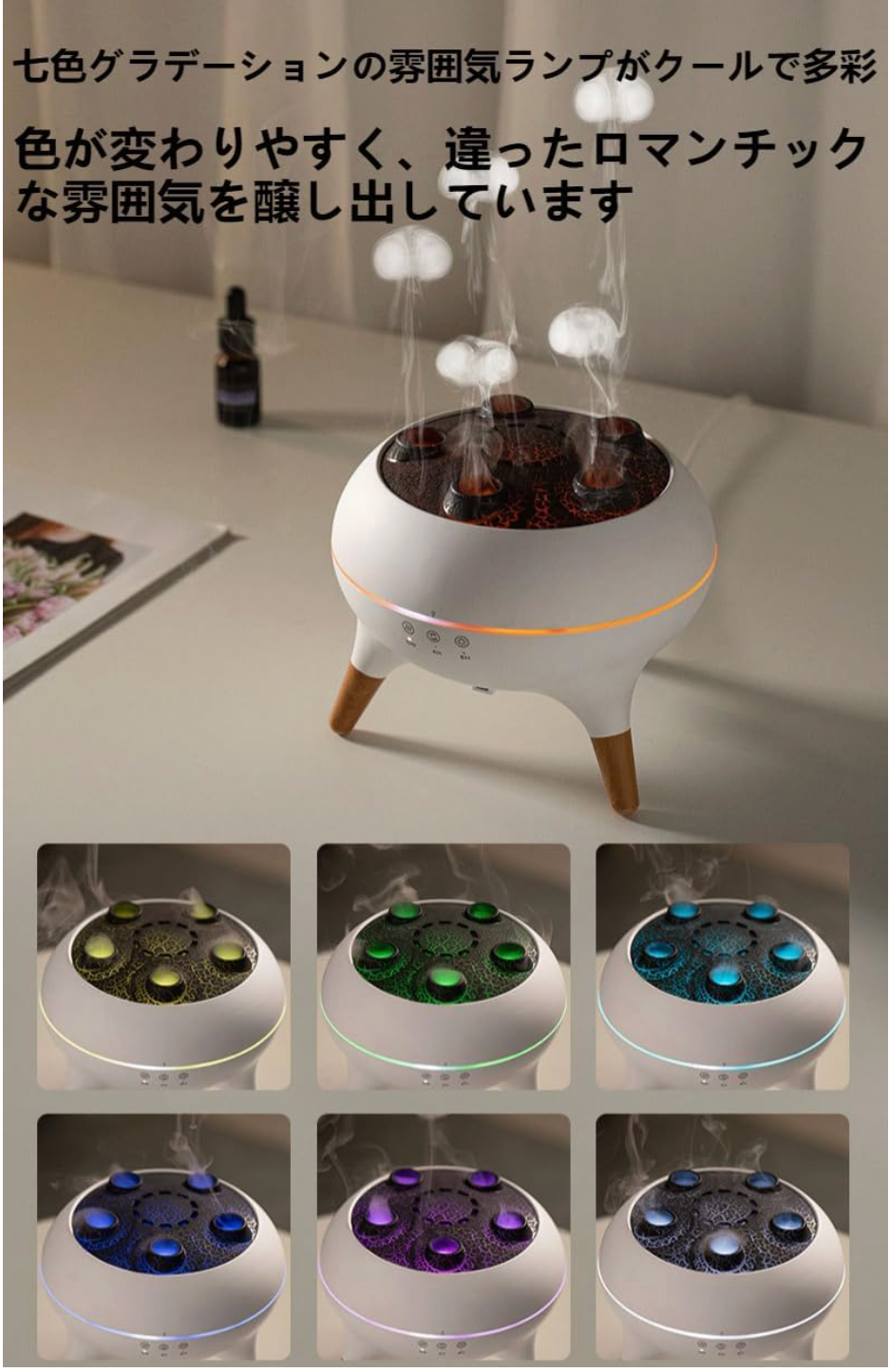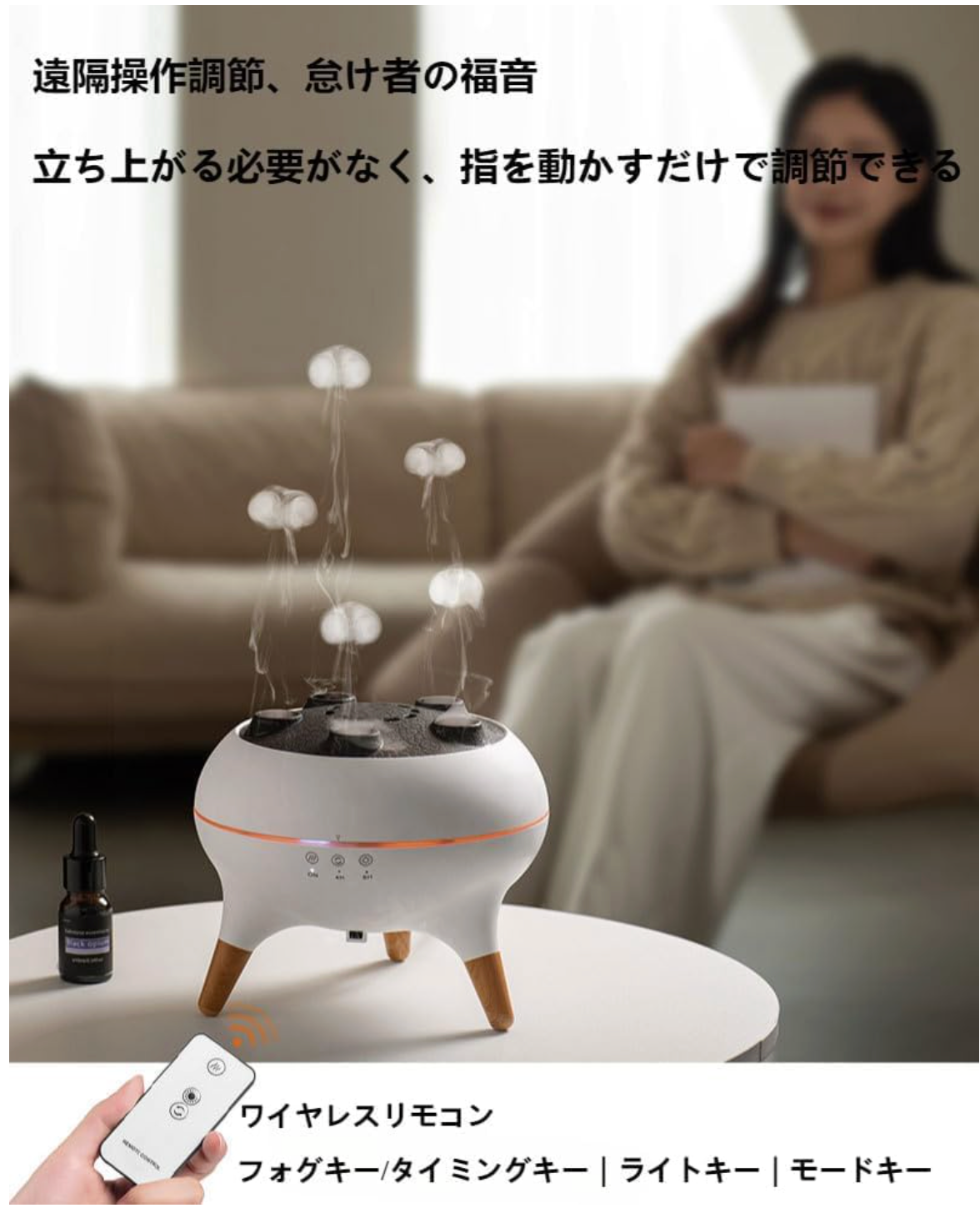 JellyWaveは、お部屋の空気をやさしく潤しながら、幻想的なライトとアロマで癒しの空間を作る加湿器です。リラックスしたい方に最適です。